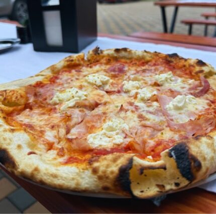 Aluatul casei, Sos roşii Monte Pomodori, Mozzarela, Prosciutto Cotto, Cremă de brânză, Fistic
